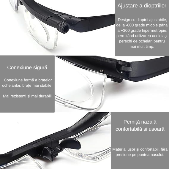 Acesti ochelari reglabil permite trecerea rapidă între citit și vedere la distanță, oferind claritate și confort pe tot parcursul zilei.